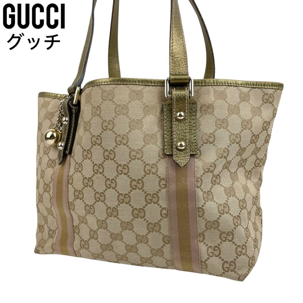 > 良品 GUCCI グッチ トートバッグ GGキャンバス シェリーライン チャーム ハンドバッグ ショルダーバッグ レザー 手提げ