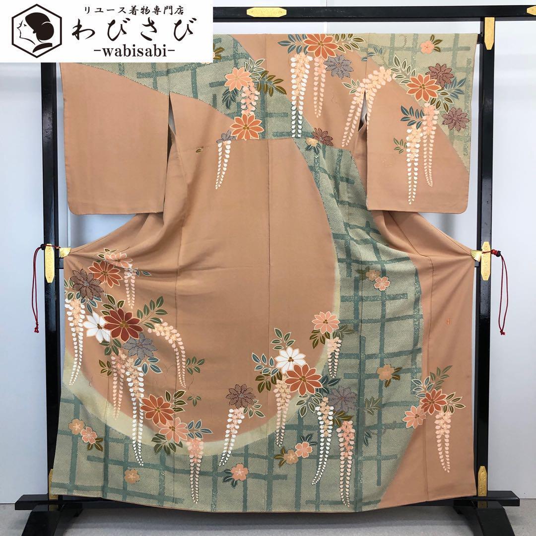 - 訪問着 作家物 花柄模様 金彩 土器色 縮緬 K-4418 着物 きもの kimono 和服 和装 中古 リサイクル着物 【送料無料】