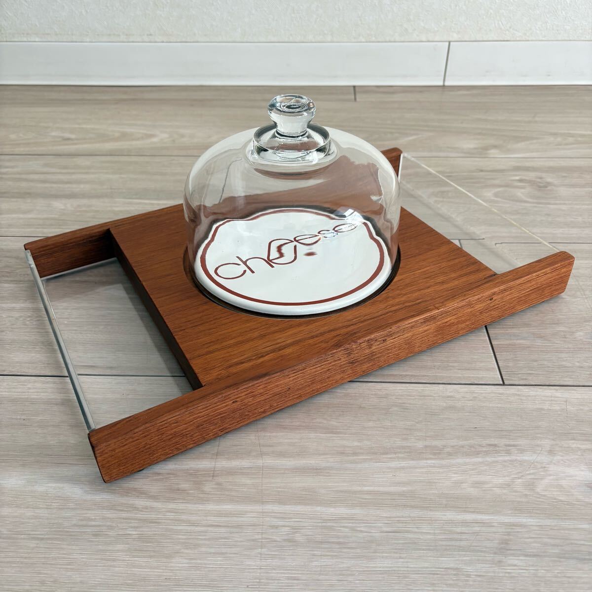 > 美品 タイ製ビンテージ GOODWOOD チーク無垢材×ホーロー×アクリル×ガラス チーズトレイ&ガラスドーム