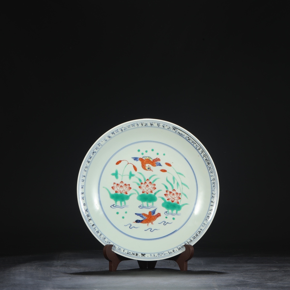 > 明時代 宣徳 五彩 鴛鴦水藻梵文大盤 唐物 箱付き 陶磁器 中国美術 古美術 置物 高さ3.5cm 直径23.5cm RG277