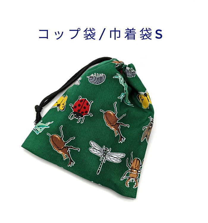 > コップ袋・巾着袋S【昆虫柄 グリーン】マチ無し 日本製 ランチ袋 ナフキン入れ ポーチ 給食袋 カブト虫 クワガタ トンボ カマキリ バッタ