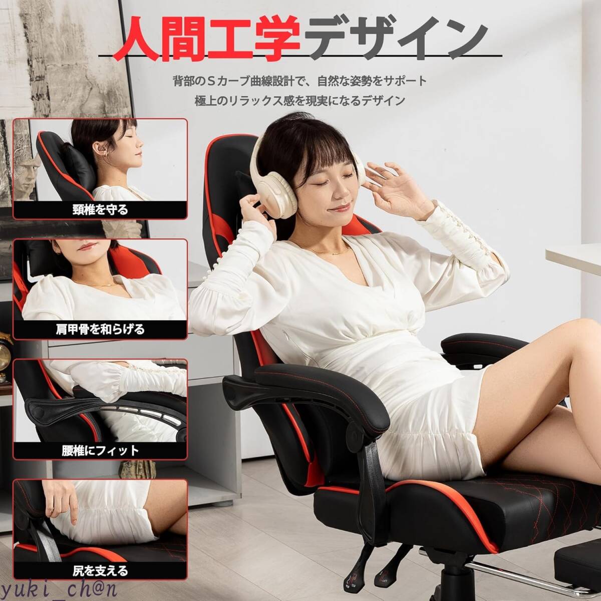 > ゲーミングチェア オフィスチェア 振動機能付き PUレザー オットマン付き 145°リクライニング おしゃれ ブラック&レッド
