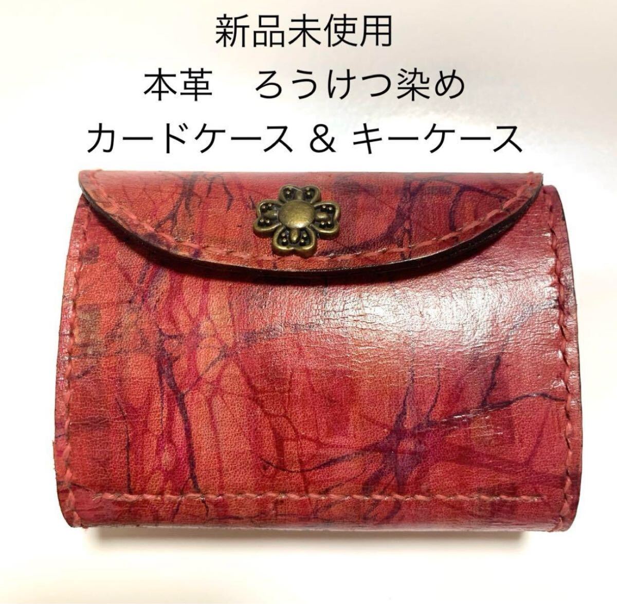 - 新品未使用 本革ろうけつ染め キーケース カードケース レザークラフト レザー小物 ピンクブラウン ミニ財布 臈纈染 名刺入れ