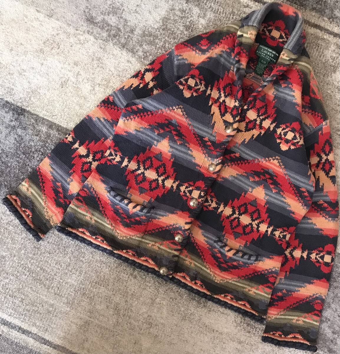 > 圧巻のサウスウエスタン柄 美配色 90's vintage ★ LAUREN RALPH LAUREN ★ ネイティブ柄 オルテガ柄 ボーダー ニット カーディガン ガウン