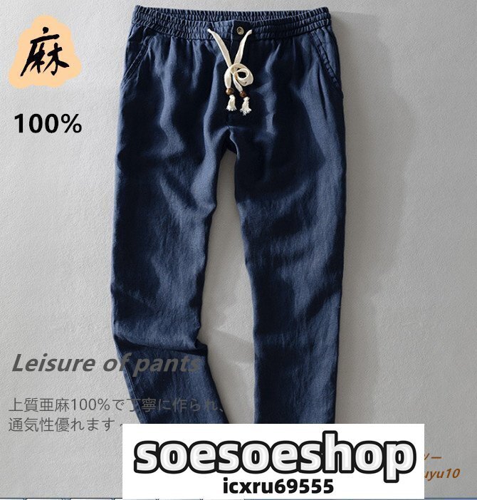 - 夏新品 リネンパンツ 麻100% メンズ スラックス チノパン 紳士 ロングパンツ最高級 サマーパンツ ストレート 無地イージーパンツ 紺 38