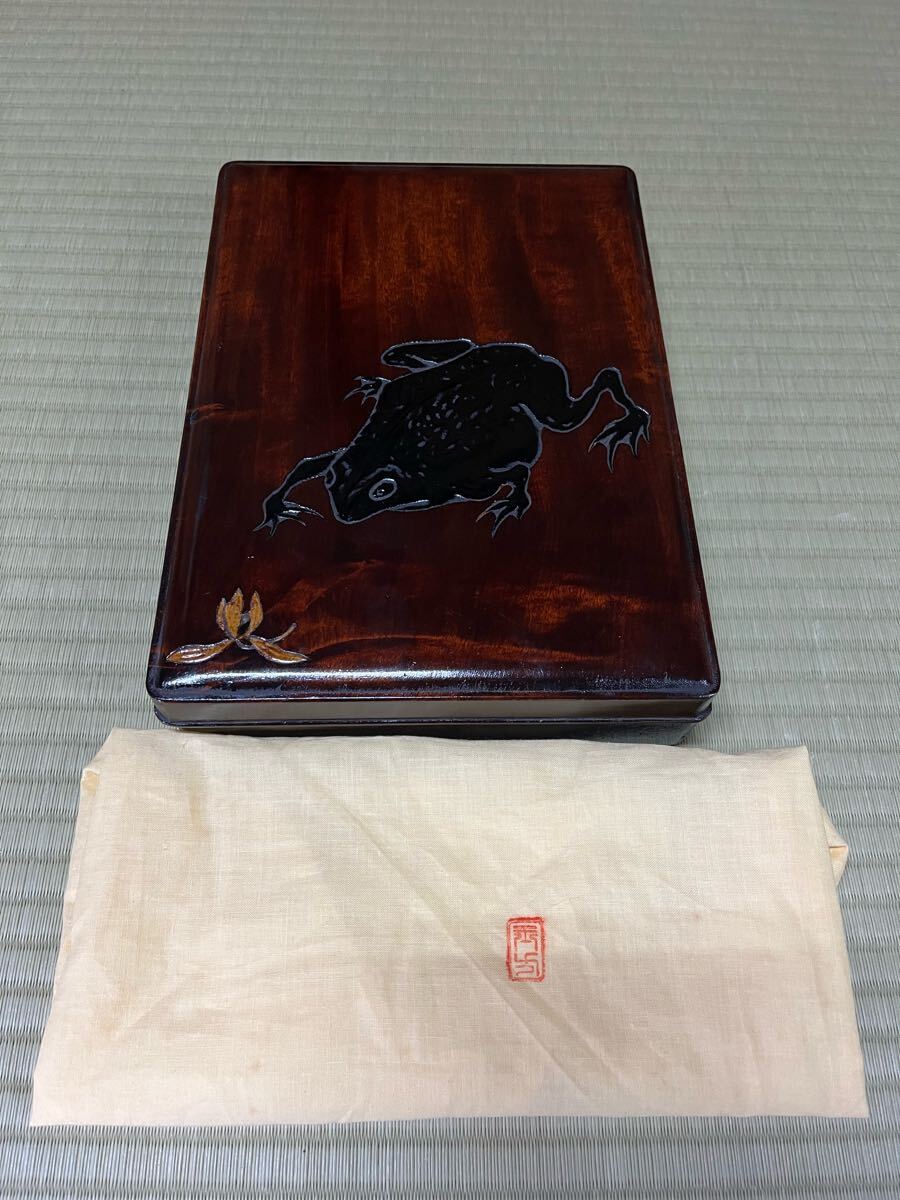 - 讃岐彫 玉方道人刀 玉堂造 硯箱 蛙 彫刻 文箱 書道具 漆器 木製 木製漆器