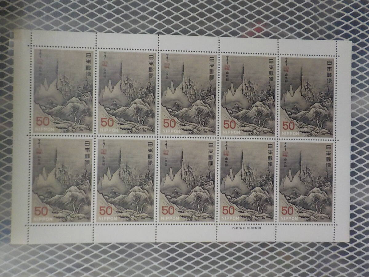 - 国宝シリーズ 1969年 秋冬山水図 雪舟等楊 水墨画 冬景 / 50円切手シート 未使用