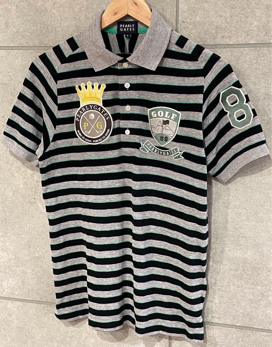 - 夏場に! PEARLY GATES パーリーゲイツ 半袖ポロシャツ ワッペン ボーダー グレー 3サイズ メンズ ゴルフウェア レターパック可 ○ 新規×