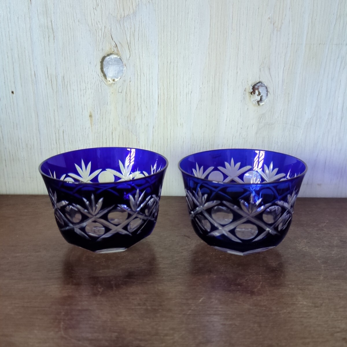- 昭和レトロ 江戸切子 小さめのロックグラス ぐい呑 蕎麦猪口 酒器 ブルー 青 コップ ガラス 冷茶