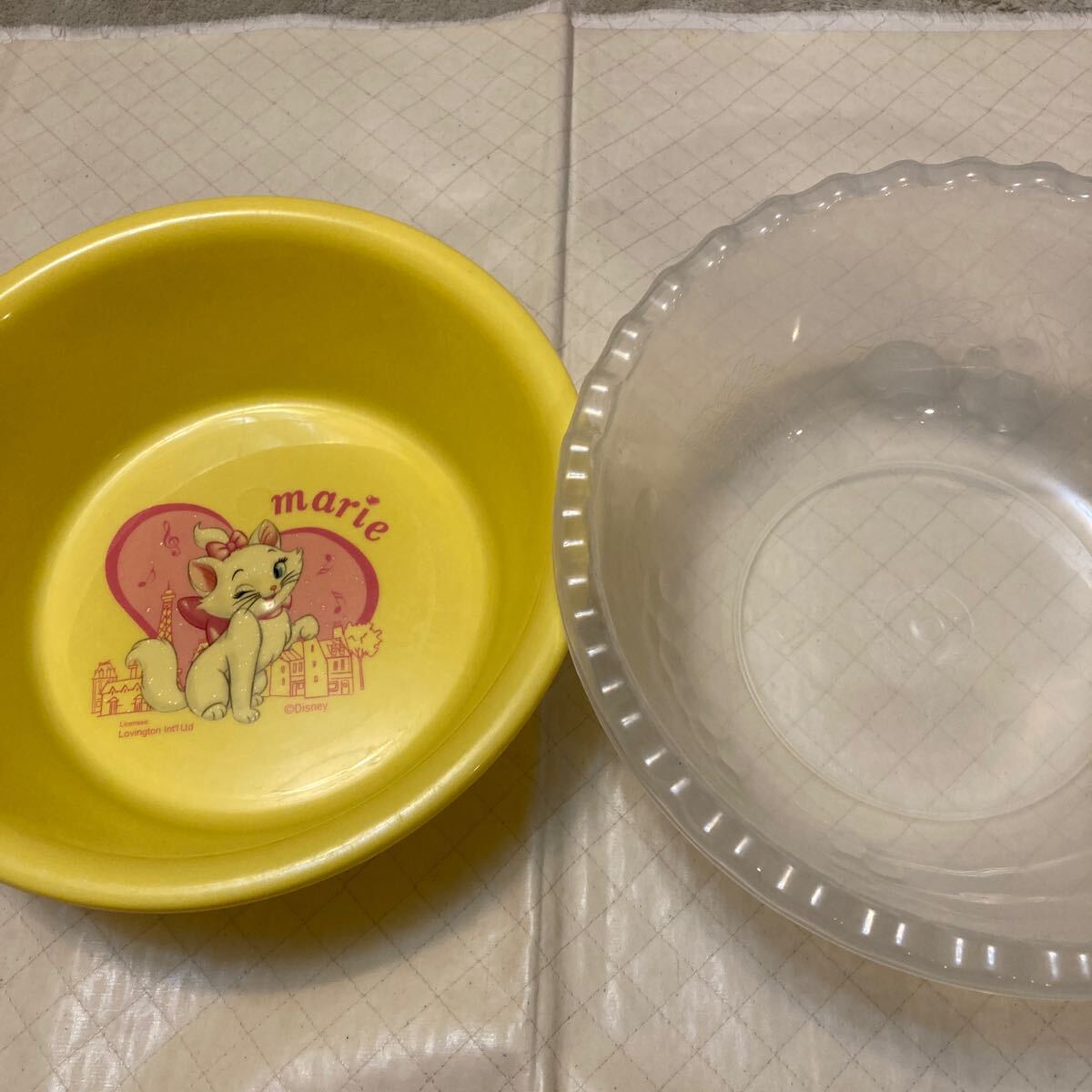 - ディズニー おしゃれキャット マリー 洗面器 黄色 ユーズド 半透明 フルーツ柄 ダイソー 未使用 2個セット 平成レトロ