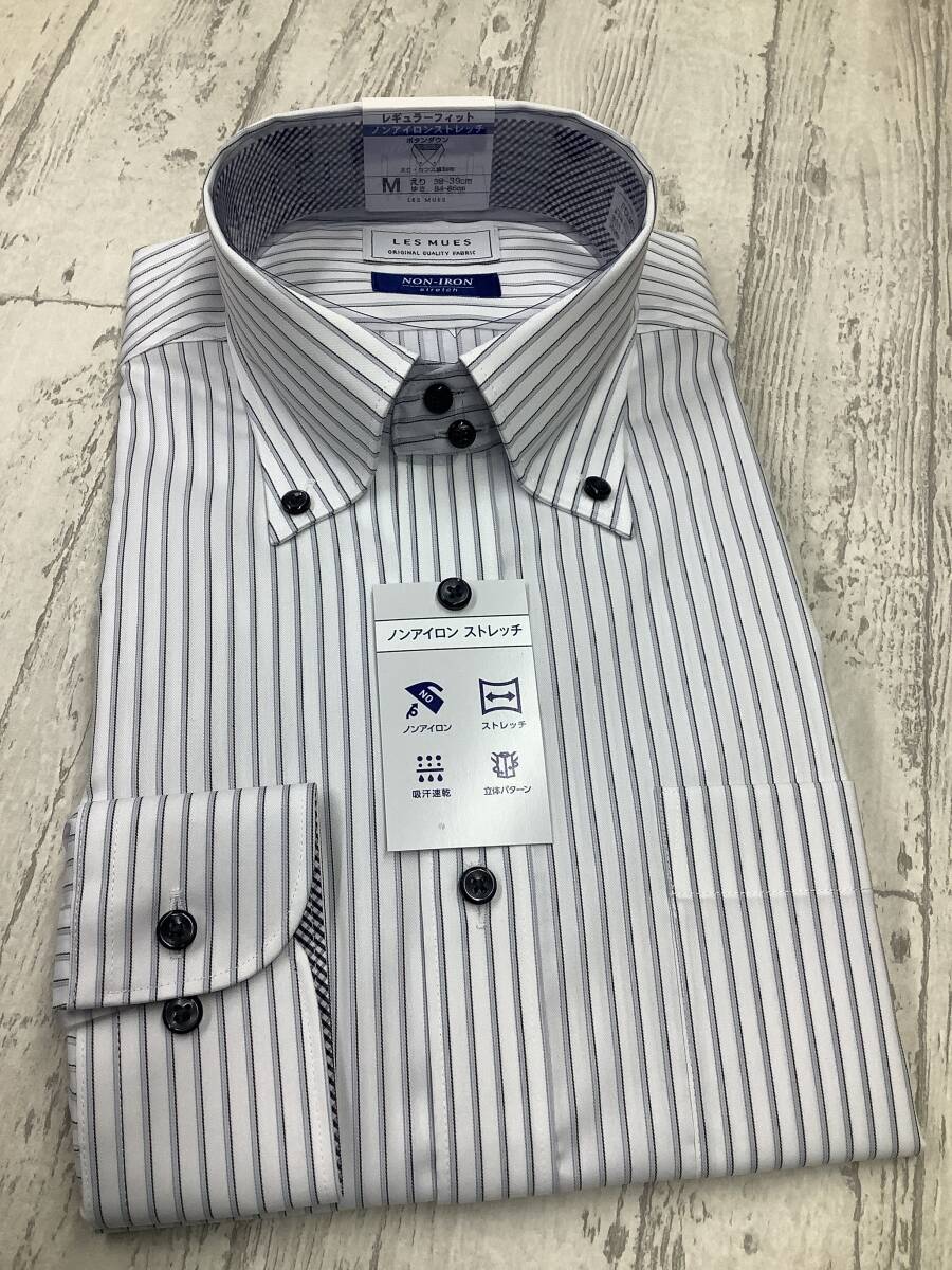 - 39-86 長袖Mサイズ ★黒系グレー系ラインストライプジャガード ノンアイロンストレッチドレスシャツ デュエボットーニボタンダウン
