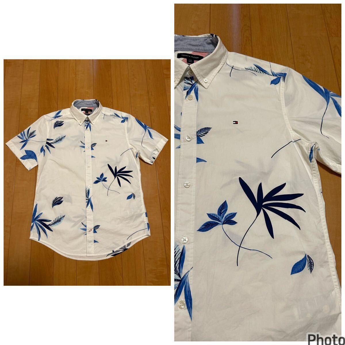 > 良品☆トミーヒルフィガー.SLIM FIT メンズサイズL ストレッチ生地・半袖BDシャツ型.希少アロハシャツ ロゴ刺繍入&OP風ハワイアン総柄 白