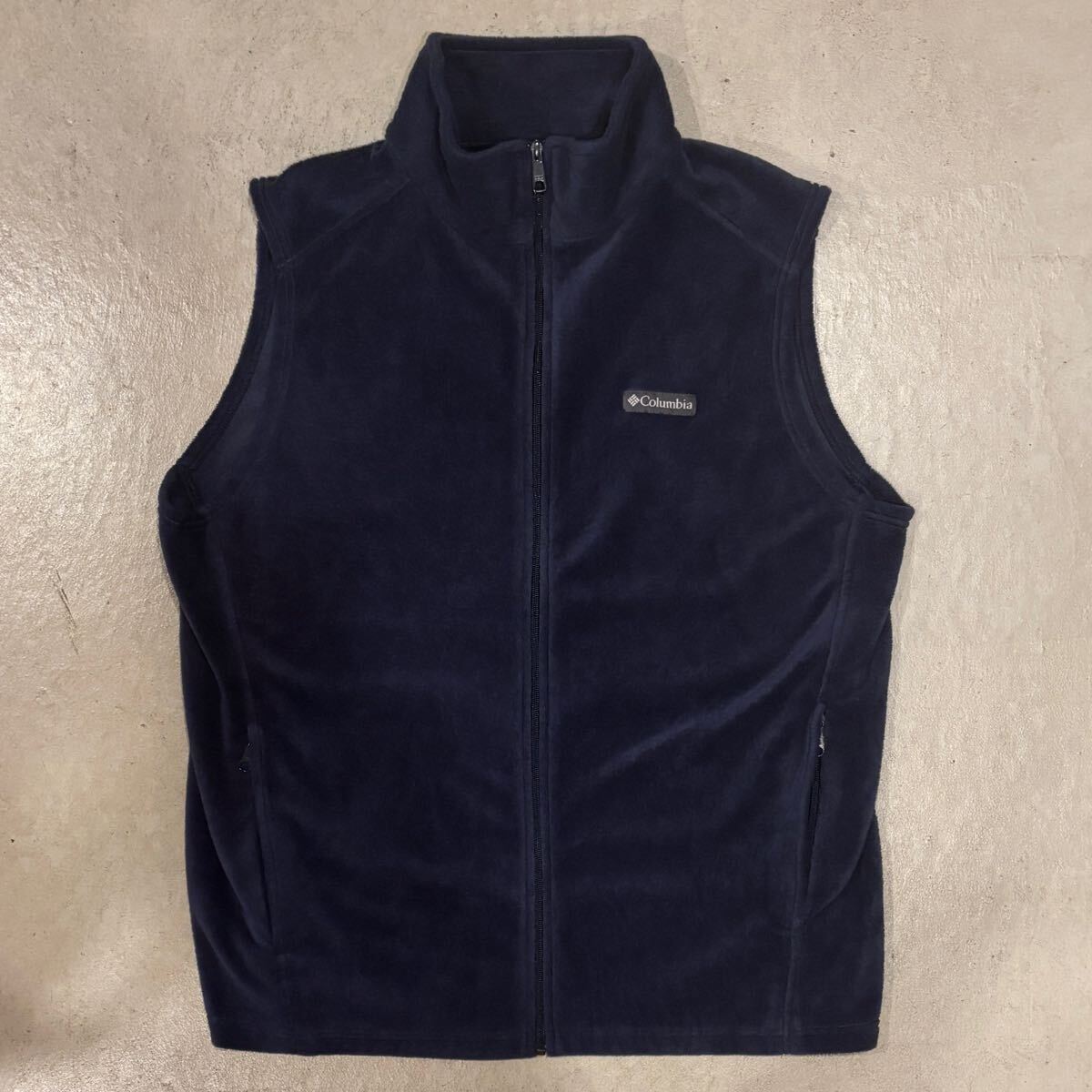 - 【Columbia】コロンビア フリース ベスト メンズ XLT 紺/NAVY ロゴ ワンポイント アウトドア ウェア キャンプ ジップアップ 古着 USED 正規
