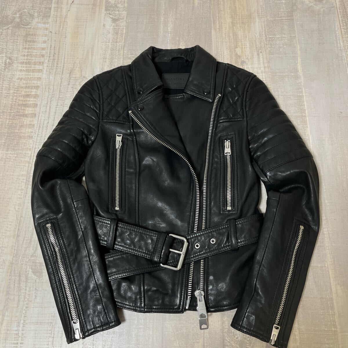 > 【春レザー 未使用級 パデット付】ALLSAINTS オールレザー シープスキン ダブル バイカー ライダース ジャケット オールセインツ UK4 ラム