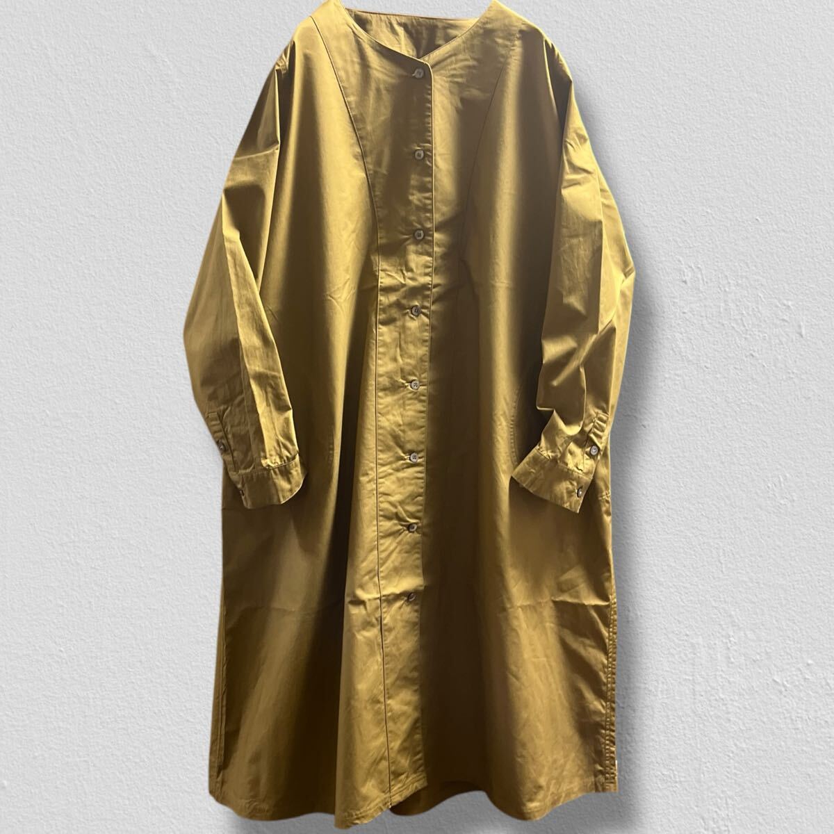 > Calm Lanka カルムランカ ノーカラーコットンロングワンピース キャメル フリーサイズ●洗濯プレス済● シャツワンピース ロング 古着/247