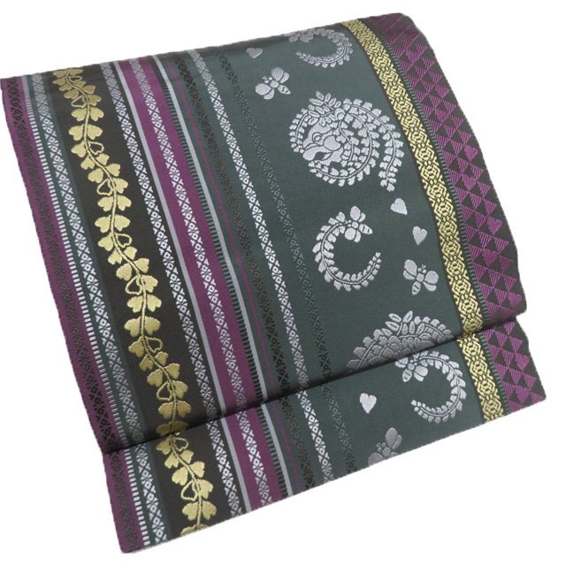 - 特選 名古屋帯 なごや帯 中古 リサイクル 正絹 カジュアル 仕立て上がり 博多織 縦段模様 植物文様 御納戸茶色 多色 きもの北條 A1160-7
