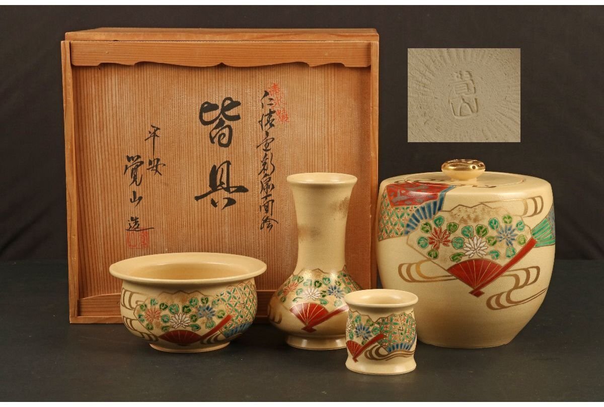 > [ギャラ藤]平安窯/平井覚山 造/仁清金彩扇面絵皆具/共箱/G-1763 (検索)骨董/水差/水器/水注/茶釜/茶碗/皆具/水指/京焼/清水焼