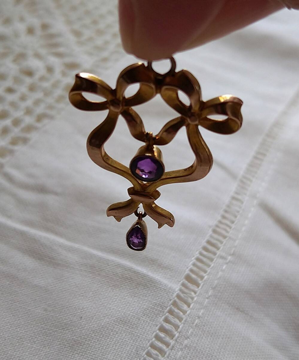 - (送料無料)英国アンティーク 刻印あり K9 アメジスト ゆらゆらペンダントトップ リボン イギリス 9金 アメシスト
