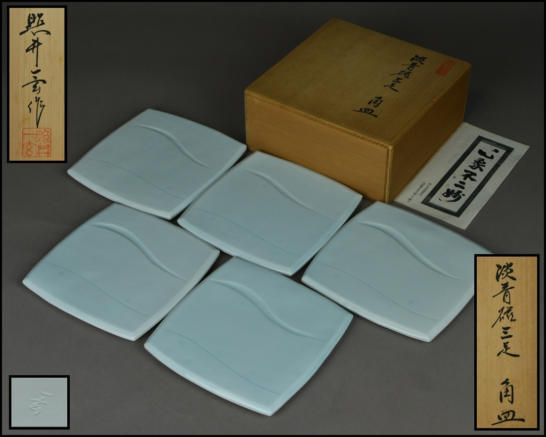 - 有田焼 岳窯【照井一玄】淡青磁 三足 角皿 五客 共箱 茶道具 D253-39
