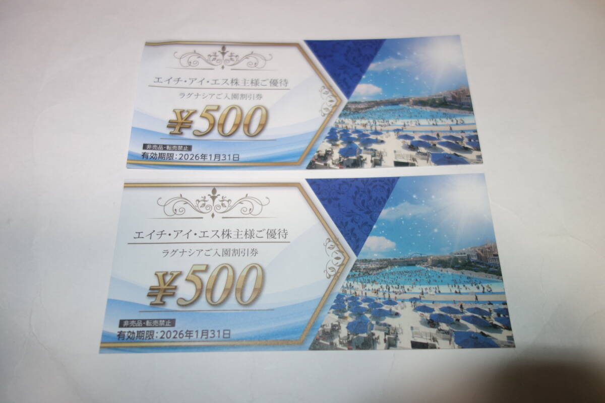 - 送料無料★HIS(エイチ・アイ・エス) 株主優待券 ラグナシア 入園割引券 1000円分 (500円券×2枚)★H.I.S