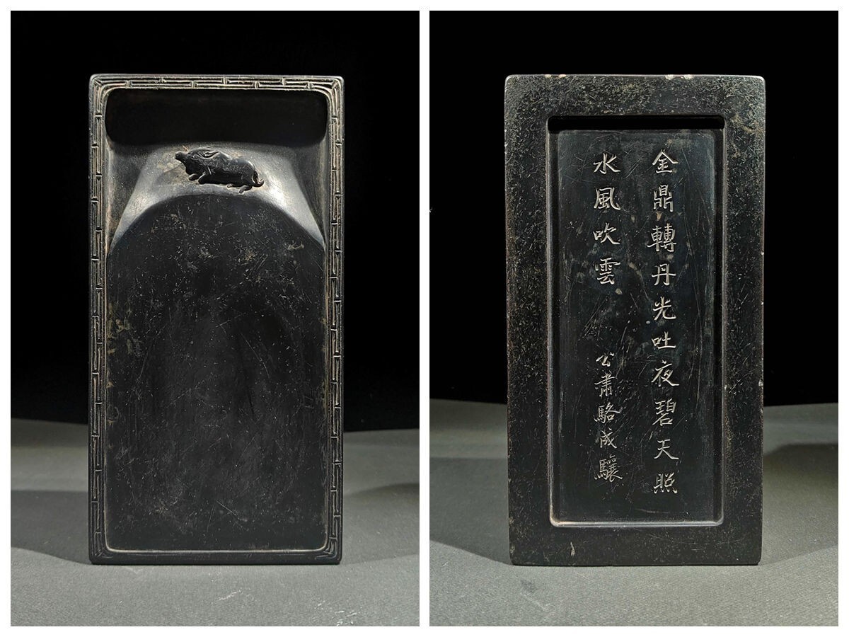 - 清代 端石浮彫 詩文瑞獣文房端渓硯 駱成驤銘【仁】手彫り 文房具 書道具 中国古硯 蔵出 骨董