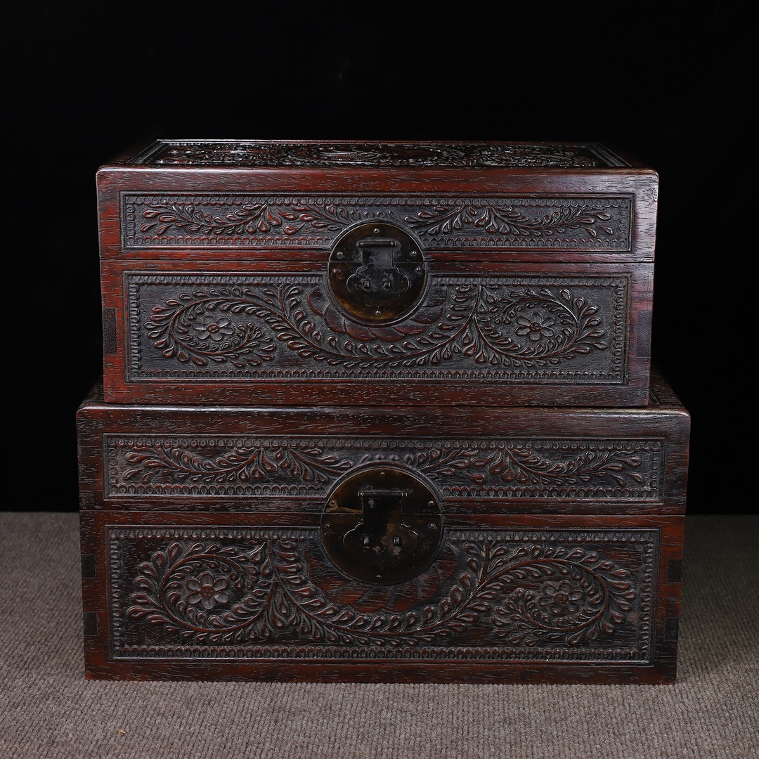 - 旧蔵 清 紫檀木 彫刻 花卉紋 套盒一套 牛毛紋清晰 包漿醇厚細膩温潤 中国古玩 古美術 骨董品 203-23
