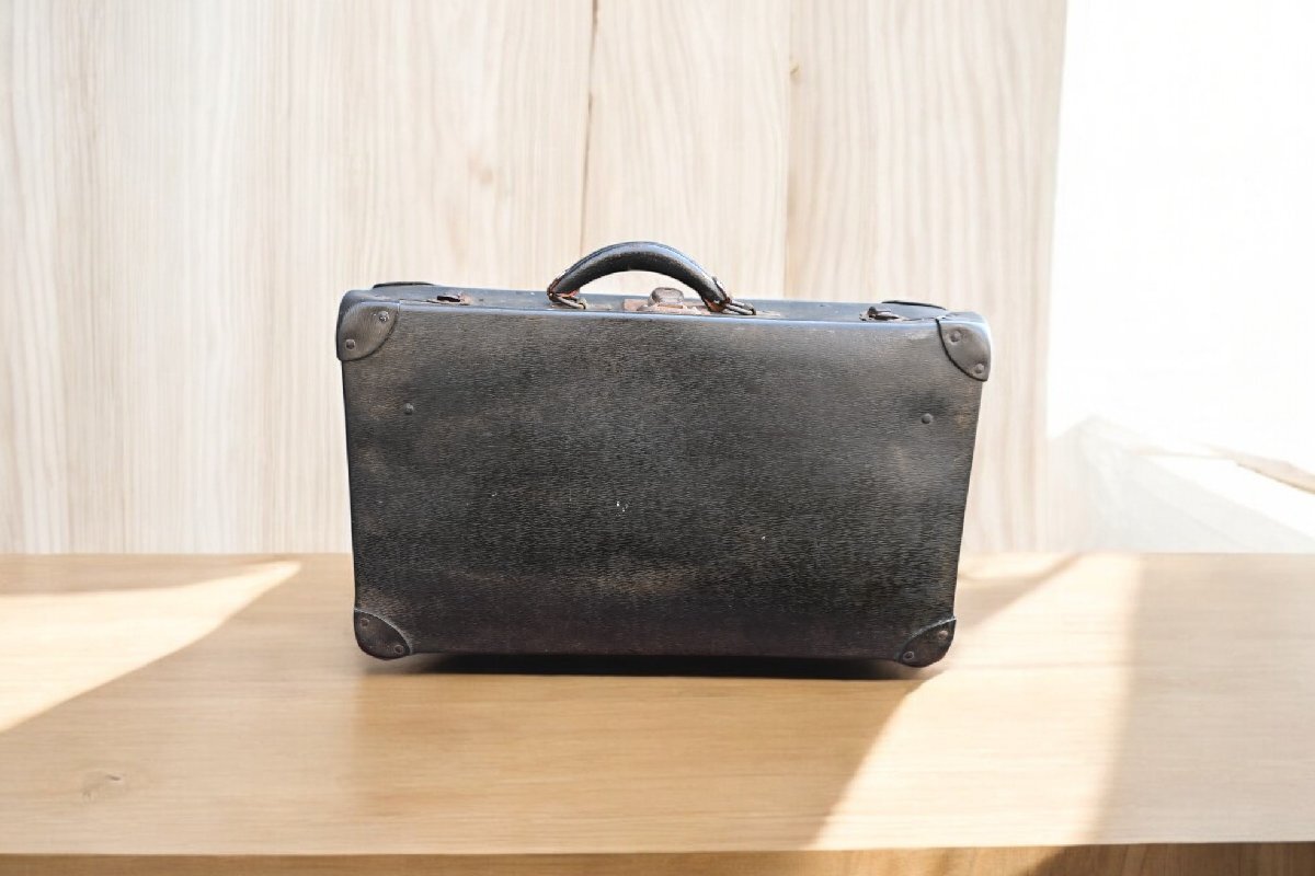 ○古いトランク お洒落なブラック 墨黒 ギンガムチェック布 旅行鞄 収納 レトロ 屋根裏 ヴィンテージ  古道具のgplus広島 2503i