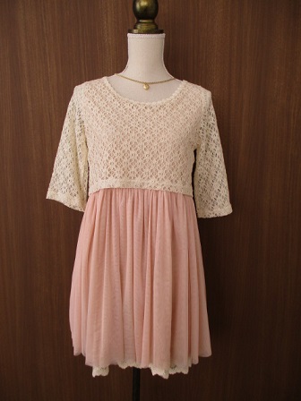 - 1054【送料無料】RETRO GIRL レトロガール 五分袖 ドッキングミニワンピース F オフホワイト×ピンク レース ソフトチュール お呼ばれ