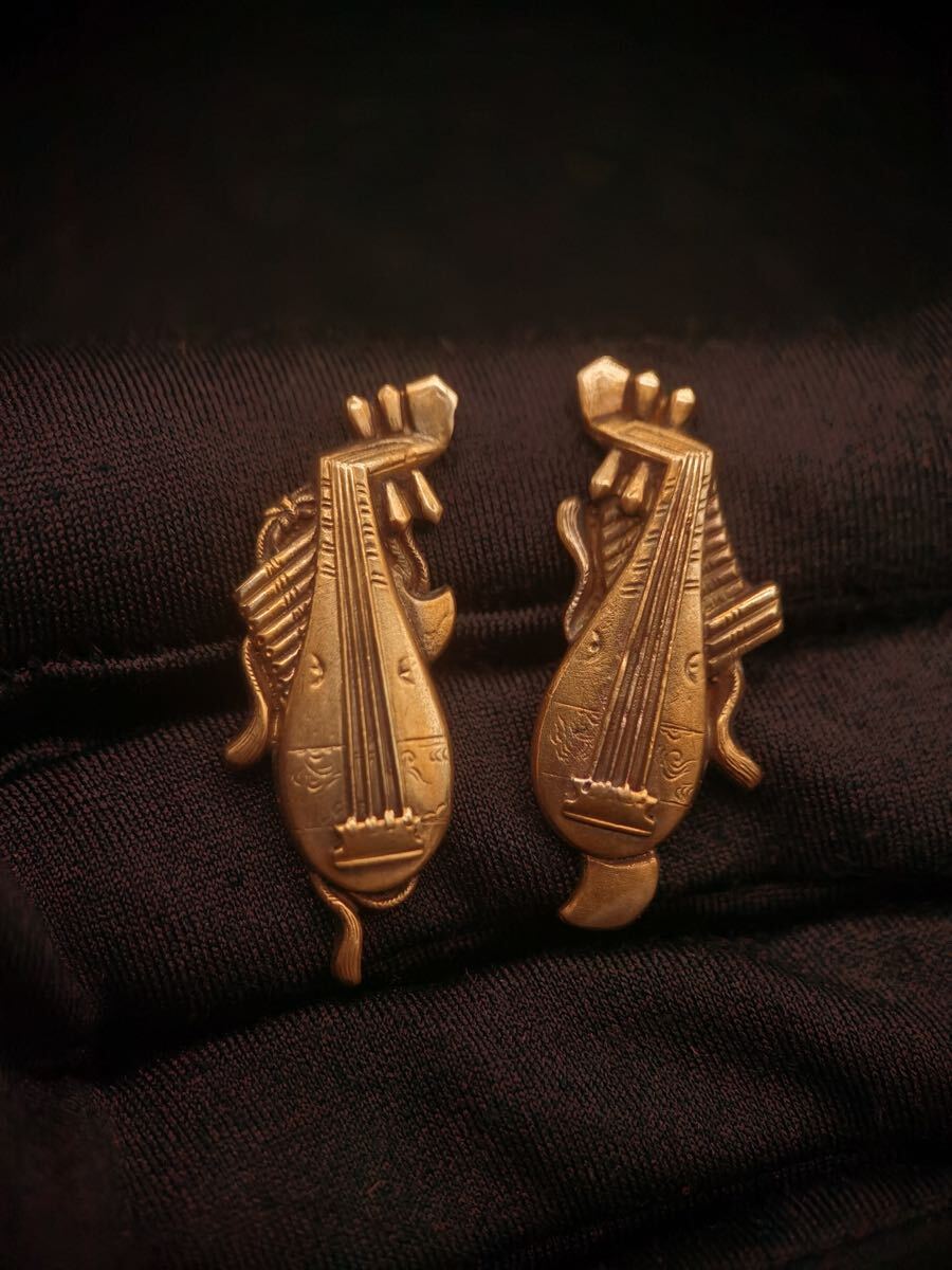 - s-142 楽器図目貫 容彫 金色絵 日本刀 武具 刀装具 銅製 小道具 鍔 目貫 縁頭 拵 長 3.5CM