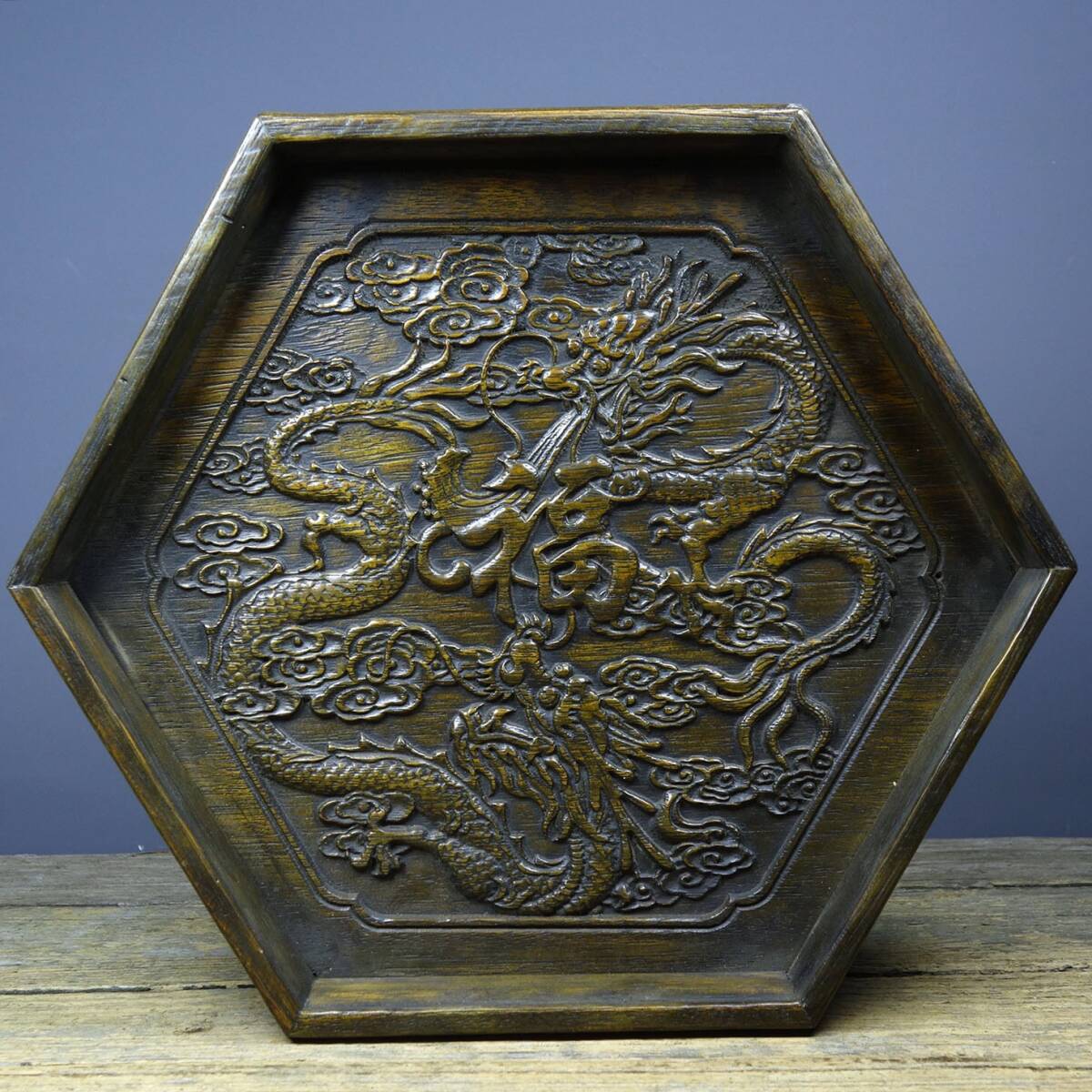 - ▽鴻▽ 花梨木製 細密彫 雙龍紋 茶盤 置物 古賞物 中国古玩 中国古美術