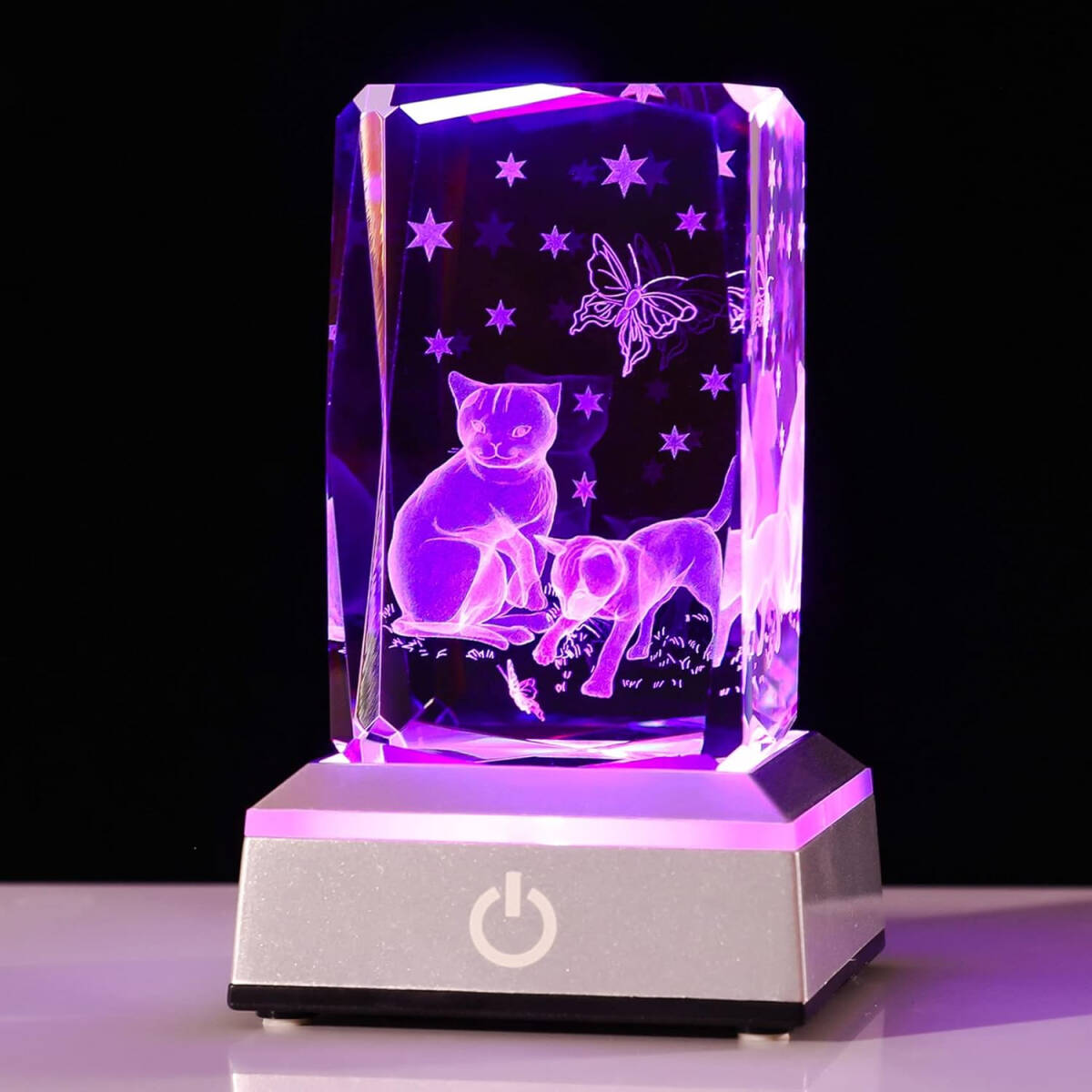 - 3Dクリスタル 猫2 LEDライトベース USB充電 レーザー彫り アート 置物 オブジェ 照明 クリア ガラス 透明 プレゼント
