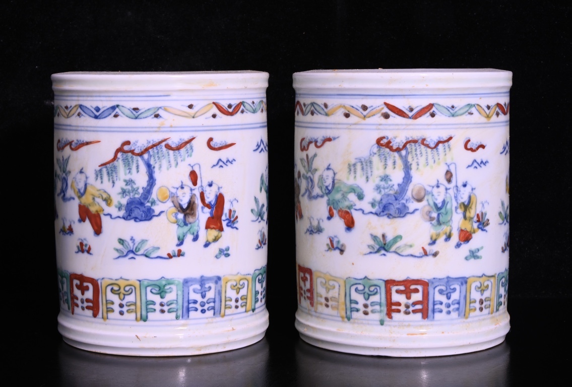 > 唐物 明 成化年製 闘彩童子紋 筆立て一対 筆道具 文房具 陶芸 磁器 古陶磁器 中国美術品 時代物 D63