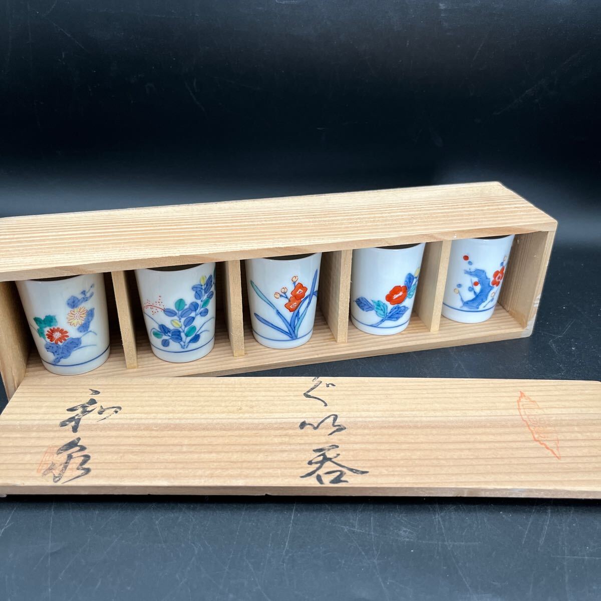 - ぐい呑み 酒盃 骨董品 和食器 日本 昭和 レトロ 木箱入り 5個セット