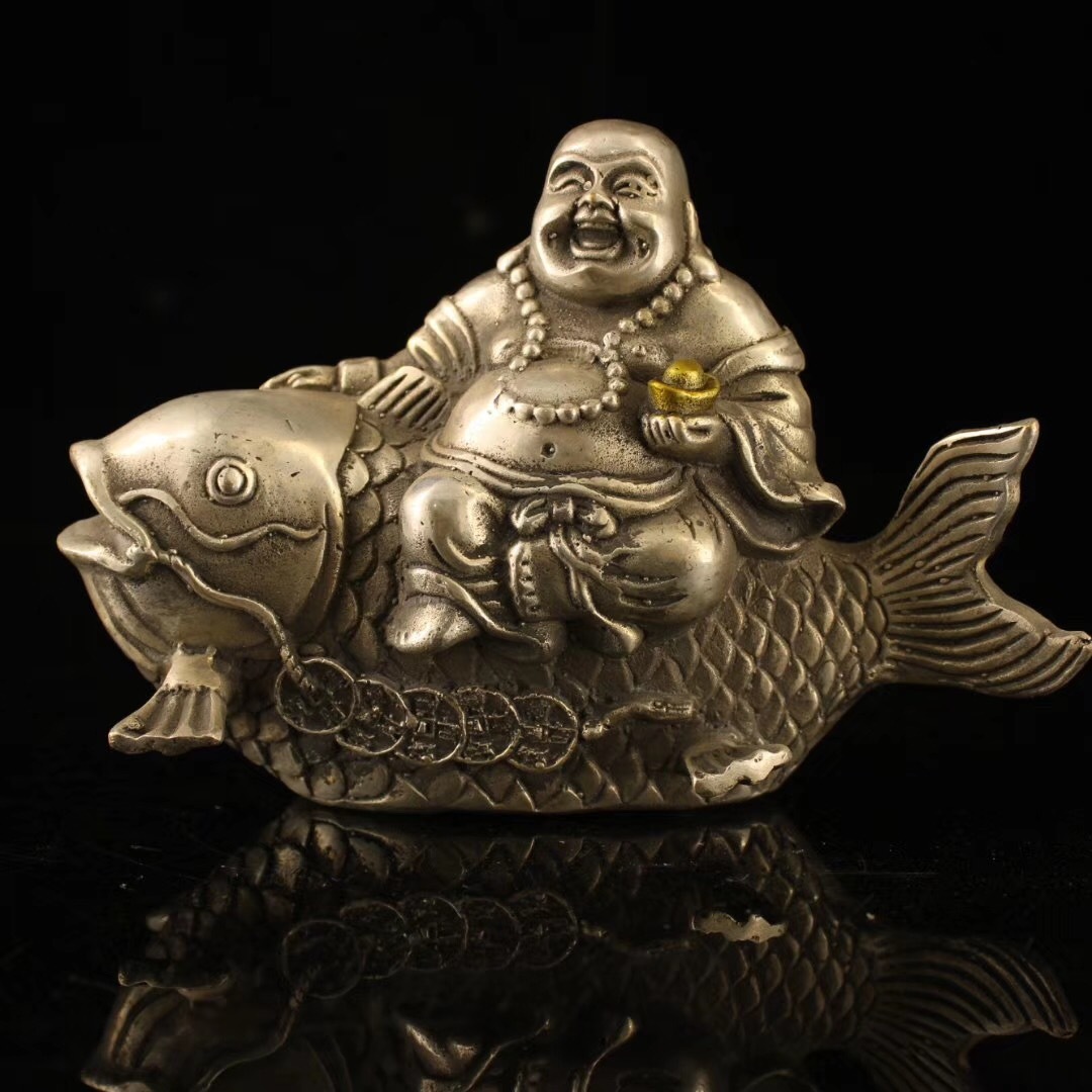 - 『館蔵珍品 銅製 金鍍銀鍍 坐魚自在彌勒仏』置物 賞物 貴重物品 収蔵品 中国古美術