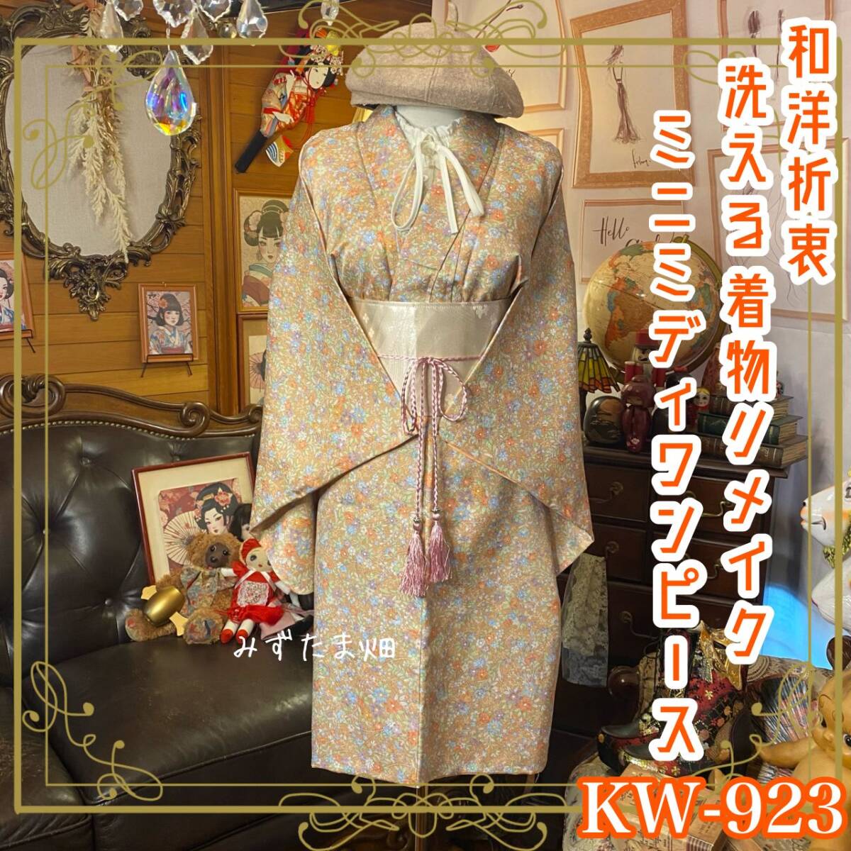 - 着物 リメイク ミニミディ ワンピース ドレス 洗える 化繊 名古屋帯ベルト 和洋折衷 やさしい風に包まれて、花咲くひととき。 KW-923