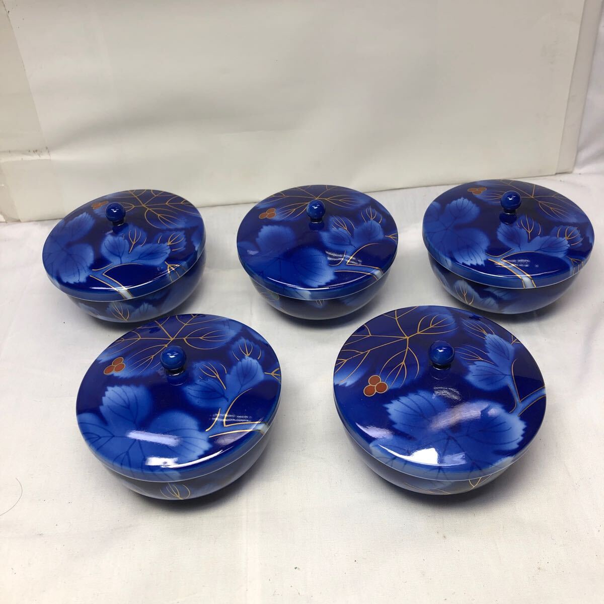 - ●深川製磁 湯呑み 蓋付 5個セット 汲出揃 瑠璃葡萄●中古