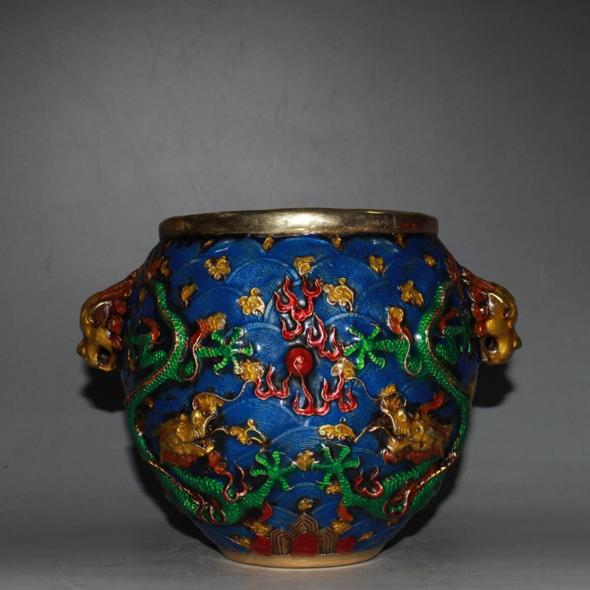 - ▽鴻▽ 銅製 景泰藍 琺瑯彩 雙龍缸 置物 古賞物 中国古玩 中国古美術