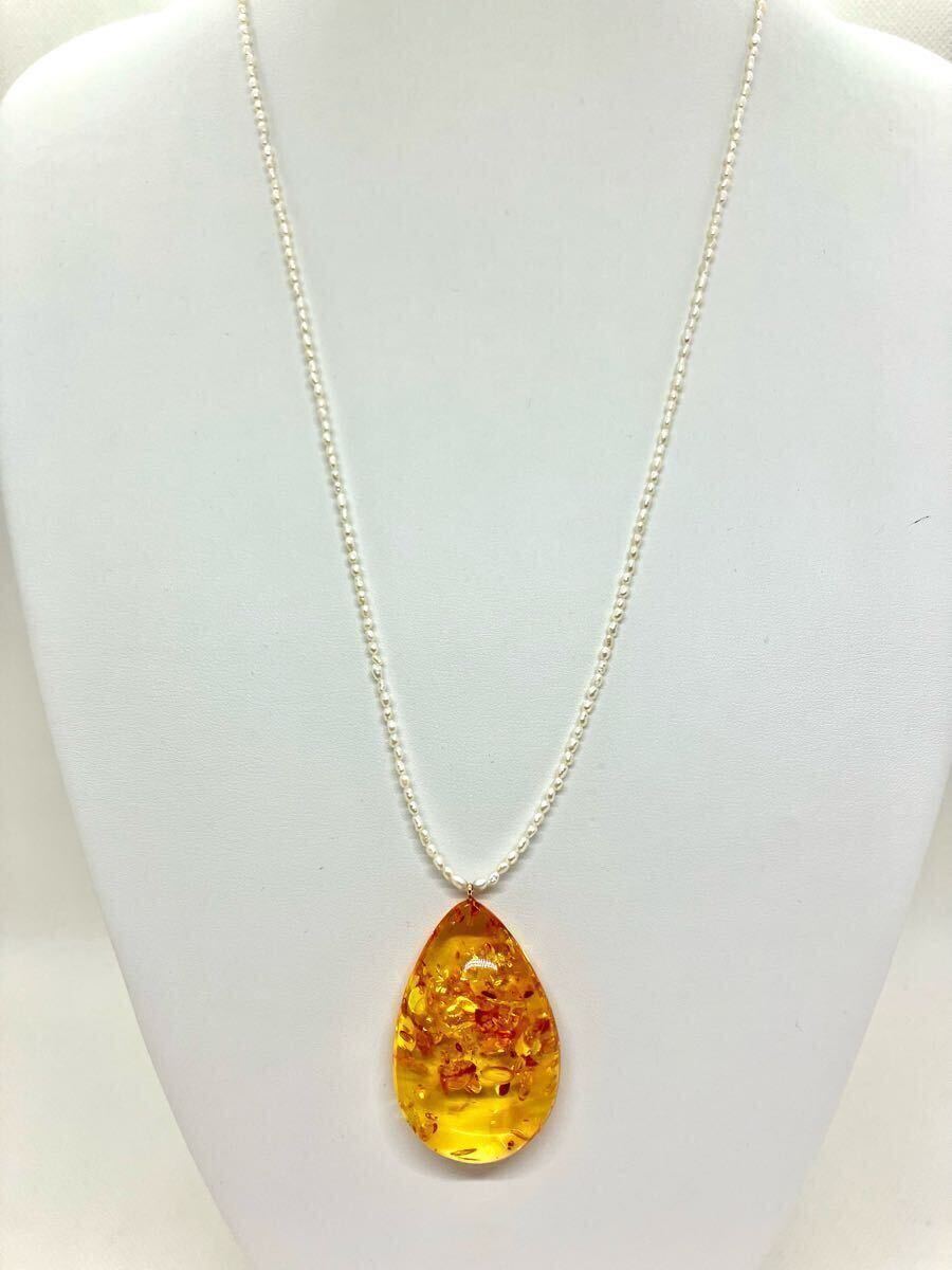> 【新品】リトアニア産琥珀×淡水ロングパールネックレス*コハク*こはく*アンバー*シンプル*一点もの*ライスパール*大ぶり*ドロップ