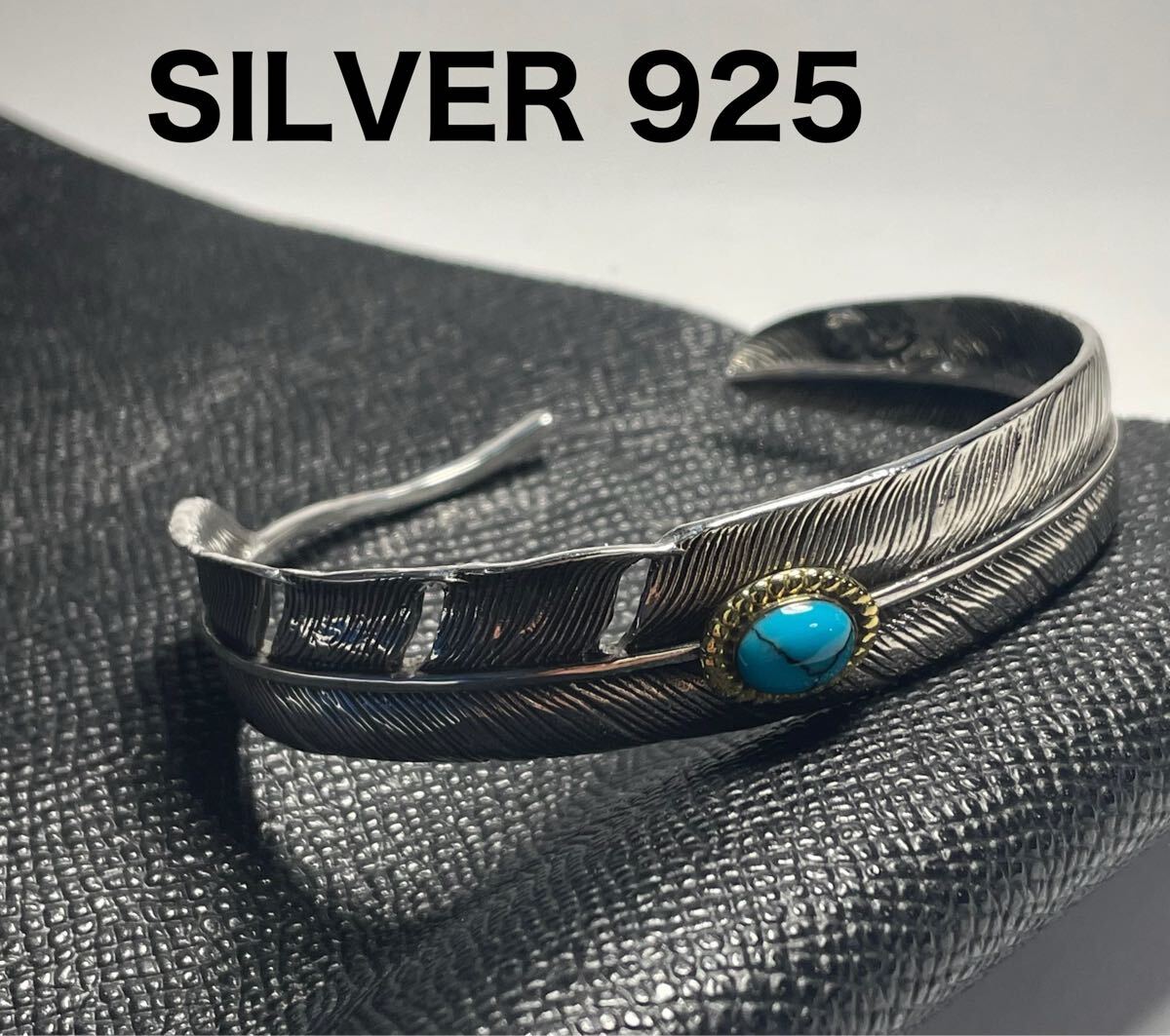 - 232SJA-39-い ターコイズ SILVER925シルバーバングル銀フェザー鷲鷹鳥 羽根ギフト7いb