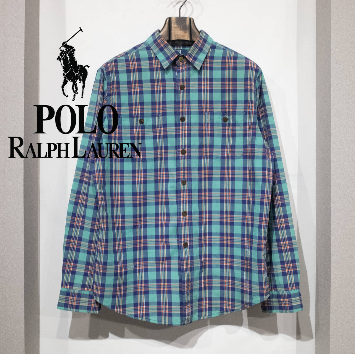 - L / 90s POLO by RALPH LAUREN ラルフローレン チェック ワークシャツ 猫目ボタン 緑 紺 オレンジ トリプルステッチ ポケット 小襟 古着