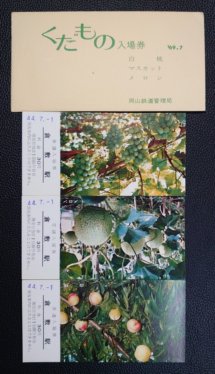 - 【記念切符】’69.7 くだもの入場券 岡山鉄道管理局/白桃 マスカット メロン/44.7.-1 倉敷駅