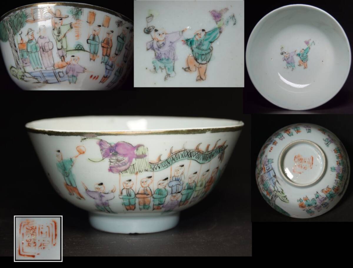 - 中国美術 同治年製 粉彩 龍舞 唐子 人物画 茶碗 色絵 金彩 中国古玩 唐物 茶道具 茶器 古美術