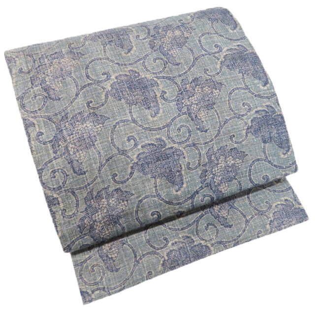 - 特選 名古屋帯 なごや帯 中古 リサイクル 麻 カジュアル 仕立て上がり 宝相唐草模様 錆浅葱色 紺色 きもの北條 A1171-9