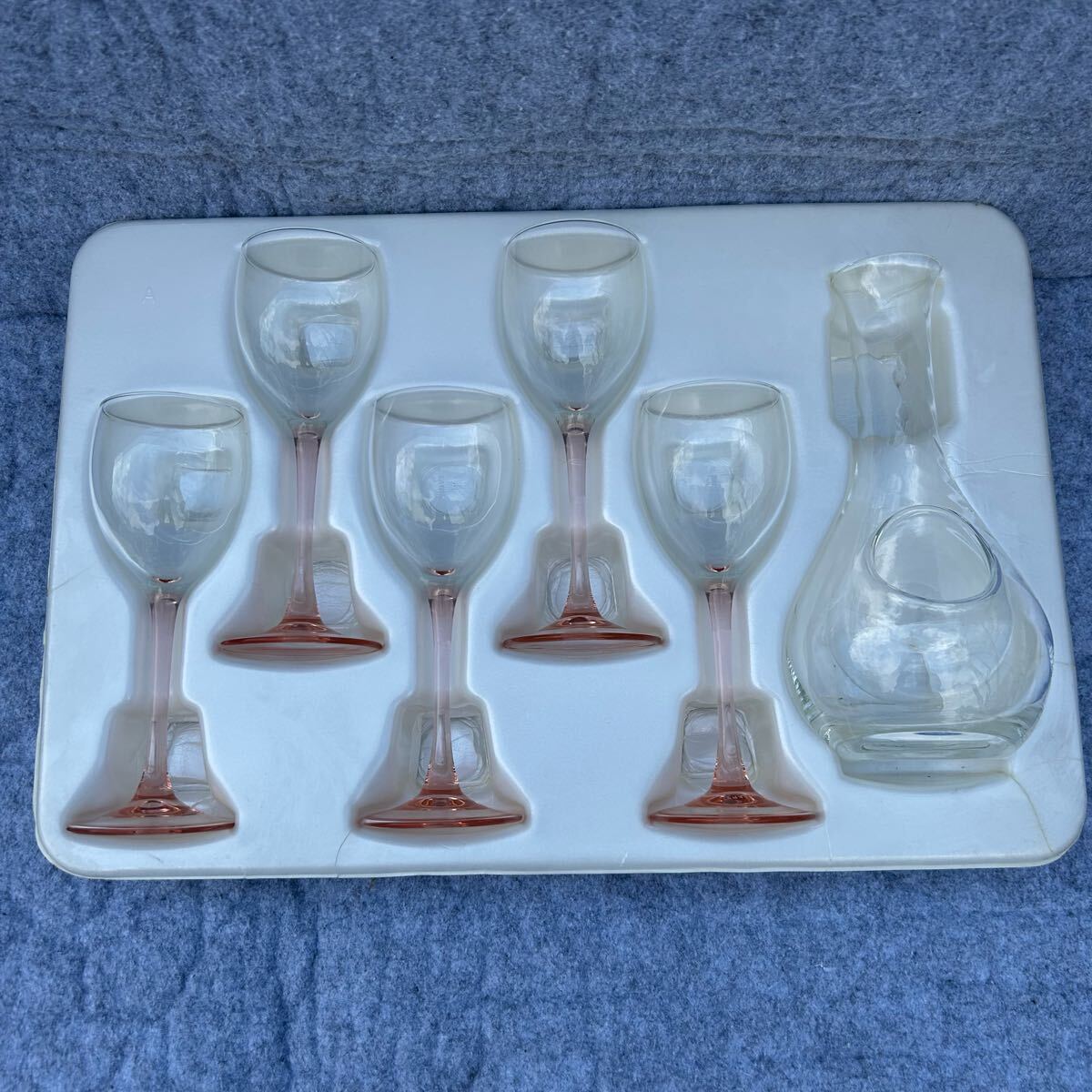 > ワイングラス デカンタセット 5客 未使用品 昭和レトロ 色ガラス グラスセット CRYSTAL シャンパン ワイン フランス France 刻印