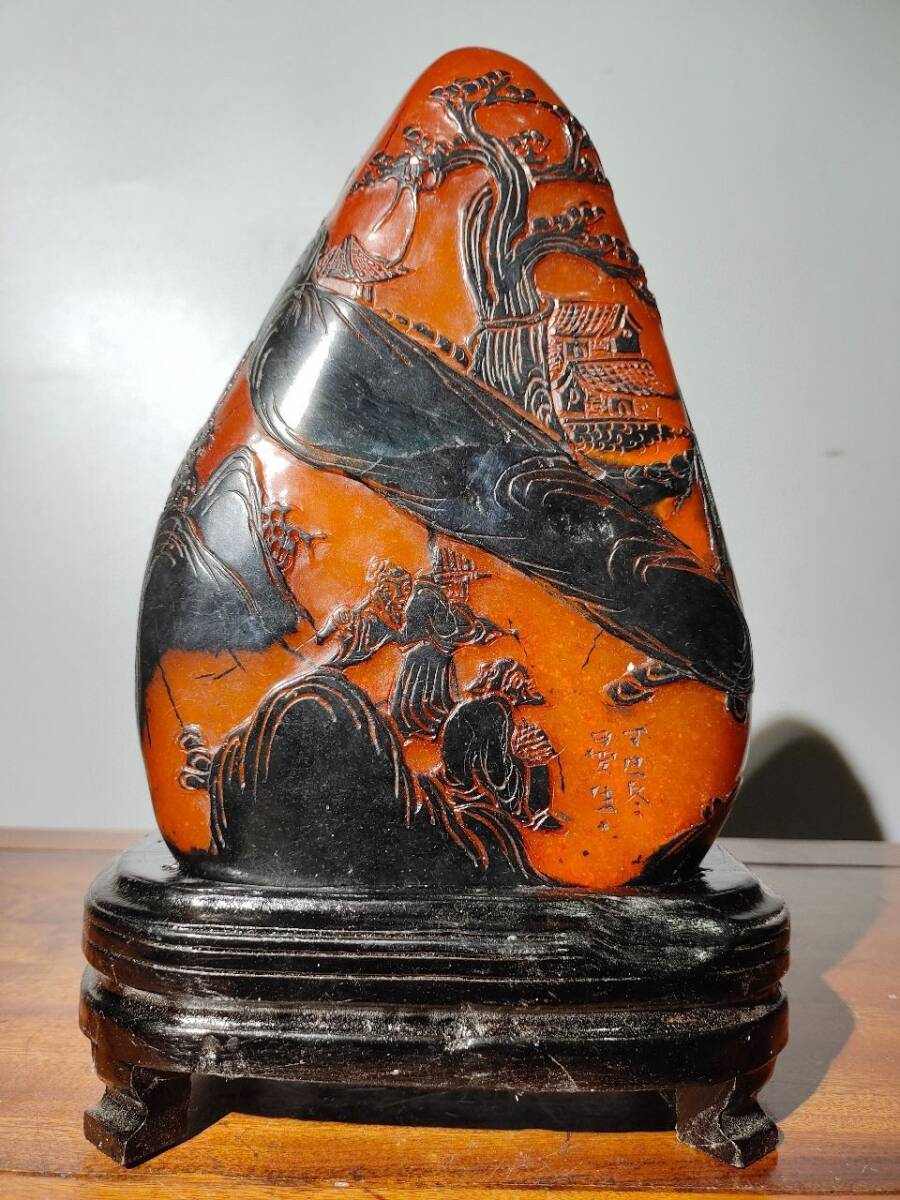 - ▽鴻▽ 寿山石 烏鴉皮 田黄石 細密彫 黑山逸仕紋印章 置物 古賞物 中国古玩 中国古美術