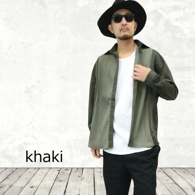 > とろみ素材 メンズシャツ 長袖シャツ ロングシャツ プリーツ 切替シャツ 2148vr 送料無料 新品 カーキ M