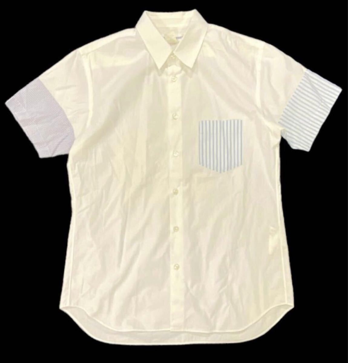 - 送料無料 フランス製 ■ COMME des GARCONS SHIRT コムデギャルソン シャツ ■ ストライプ柄 切替 半袖 ボタン シャツ ホワイト L