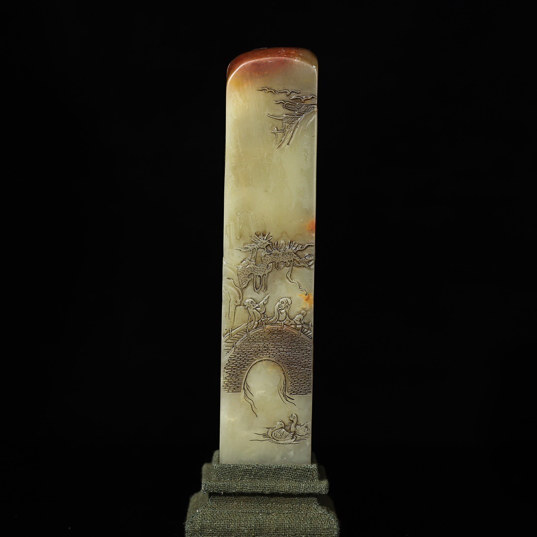 - ▽鴻▽ 寿山石 芙蓉石 細密彫 深山訪友紋印章 箱付 置物 古賞物 中国古玩 中国古美術