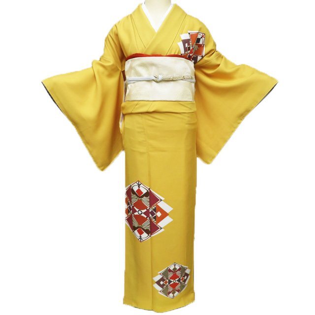 > 付下げ 付け下げ 訪問着 着物 中古 正絹 袷 フォーマル 作家物 落款 山吹色 多色 身丈165cm 裄68.5cm L トール きもの北條 A1176-9