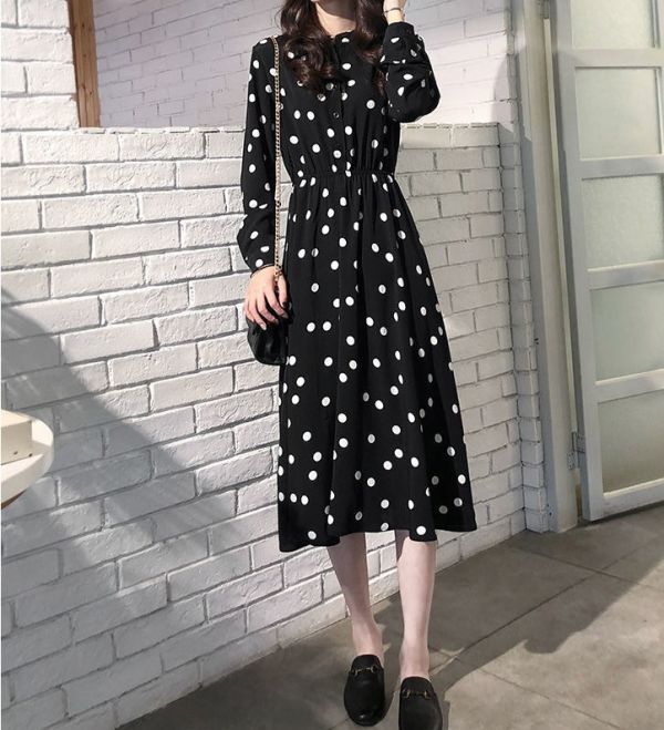 - ★★★レディース ワンピース シャツワンピー フレアスカート ドット柄プリント FX38